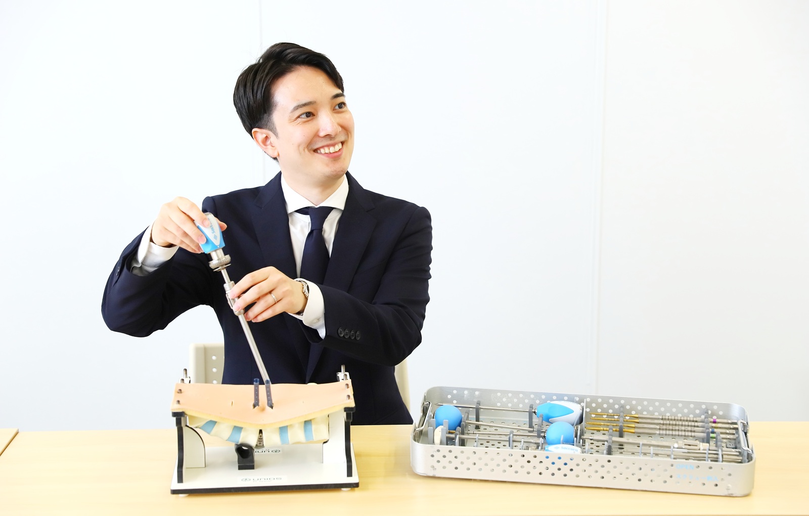 入社後の研修では整形外科、薬機法(※医薬品、医療機器等の品質、有効性及び安全性の確保等に関する法律)などに関する基礎的な座学、手術器械に関する説明のほか、先輩との同行営業や手術立会いなどを4か月かけて行いました。私は異業種からの転職でしたので、同業種からの転職組とは別に研修していただきました。独り立ちは約半年後でしたが、研修には十分時間をかけることができたと思います。